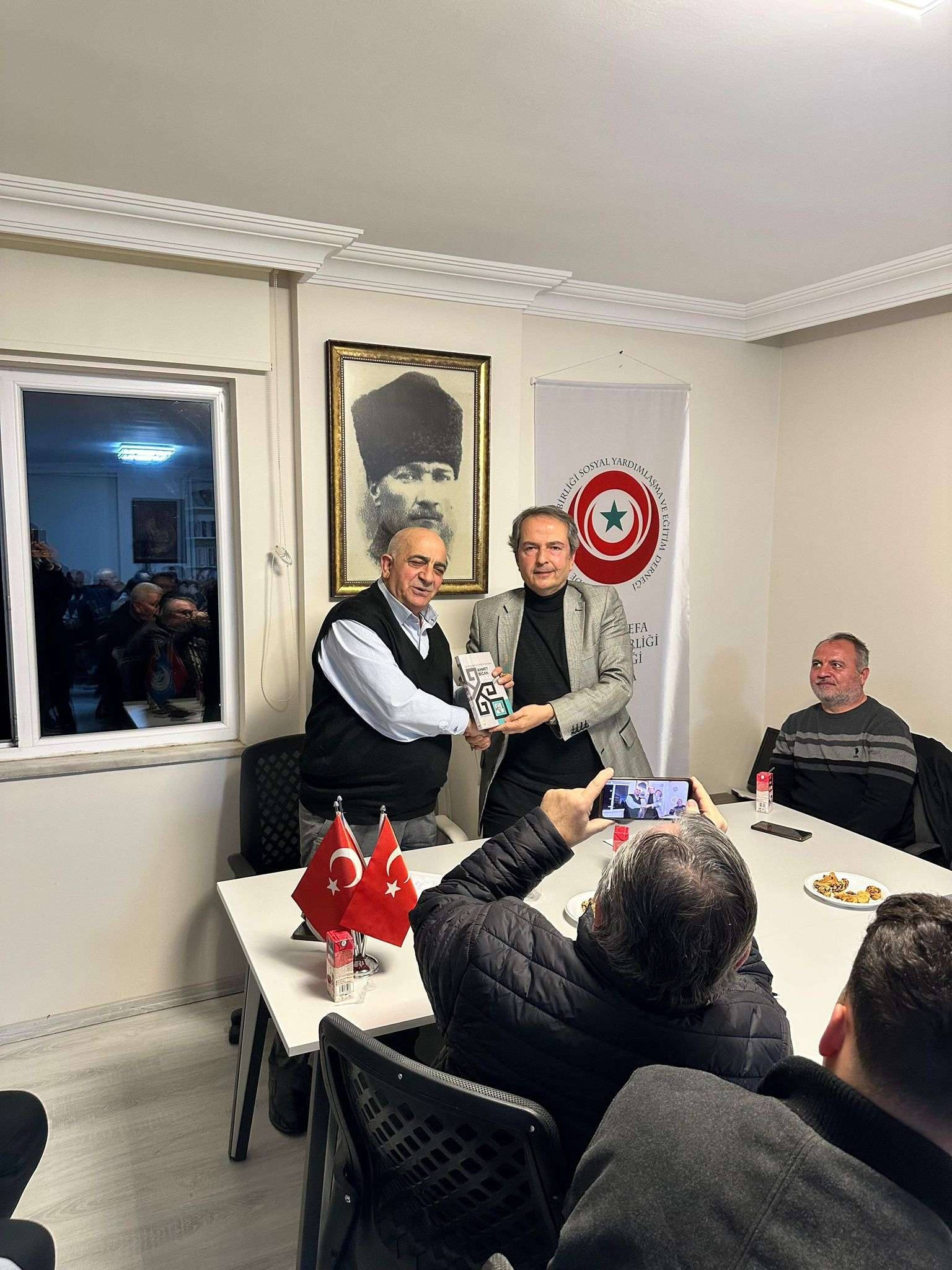 Sohbetin sonunda Ahde Vefa Turan Birliği Derneği Başkanı Harun Maral, Dr. Rahmi Şeyhoğlu’na kitap hediye etti.